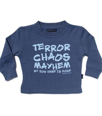 Sweat blue 1-2 yrs 'Chaos, terror,mayhem my job here is done'