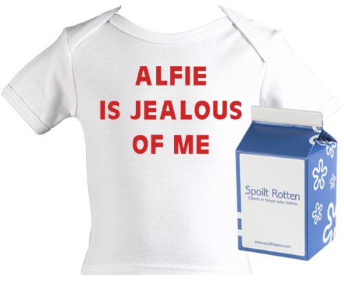 Spoilt Rotten - CUSTOM Is Jealous Of Me Baby PERSONALISED Lap T-Shirt 100% Organic Sizes 2-3 years + in funky Milk Carton