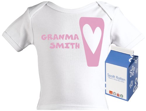 Spoilt Rotten - Grandma CUSTOM Baby PERSONALISED Lap T-Shirt 100% Organic Sizes 3-4 years + in funky Milk Carton WHITE